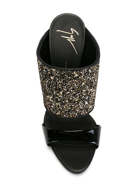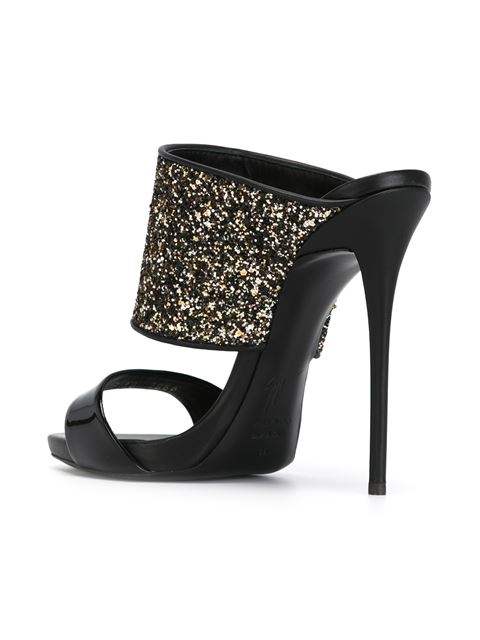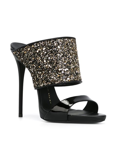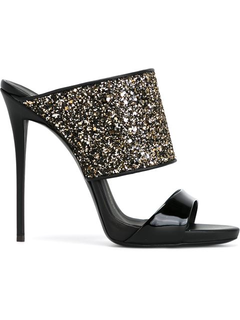 Her black calf leather glitter mules feature an open toe, a slip-on style, a varnished finish, and a high stiletto heel.