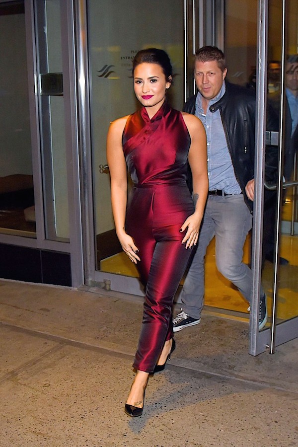 Cutie Demi Lovato was the lady in red as spotted in New York City, wearing a $1,319 Iris Van Herpen High Neck Wrap Front Sleeveless Jumpsuit: