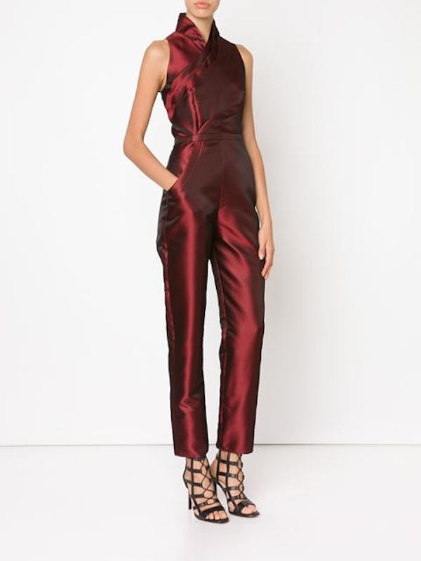 Her red silk blend jumpsuit features pleated details, wrap style front, a fitted silhouette and a back zip fastening.