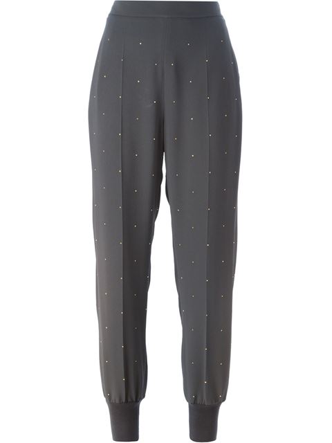Her pants have an elasticated waistband, side pockets and gathered ankles.