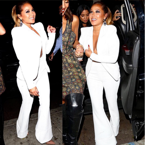 Fashion Bomb regular Adrienne Bailon stepped out to celebrate The Real being picked up for two more seasons! She loves to mix it up and gave us separates this go ’round. This white Michael Costello pantsuit was tailored to perfection. She paired her look with statement earrings and nude Louboutin pumps.
