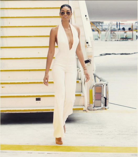Chanel Iman is quite the jetsetter. She was snapped looking like a vacation personified in this Balmain halter jumpsuit. Super chic!