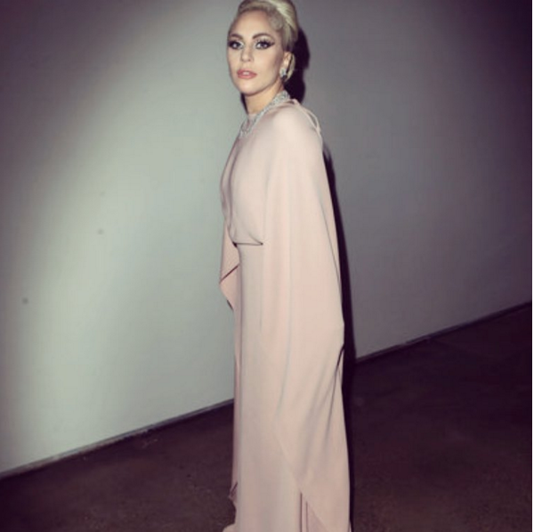 Lady Gaga sang a few jazzy tunes during an amFAR charity event. The songbird and AHS: Hotel actress looked regal in a blush colored Valentino gown. Though the silhouette dated her slightly (especially with accompanying hairstyle), hmm… the color works seamlessly with her skin tone.