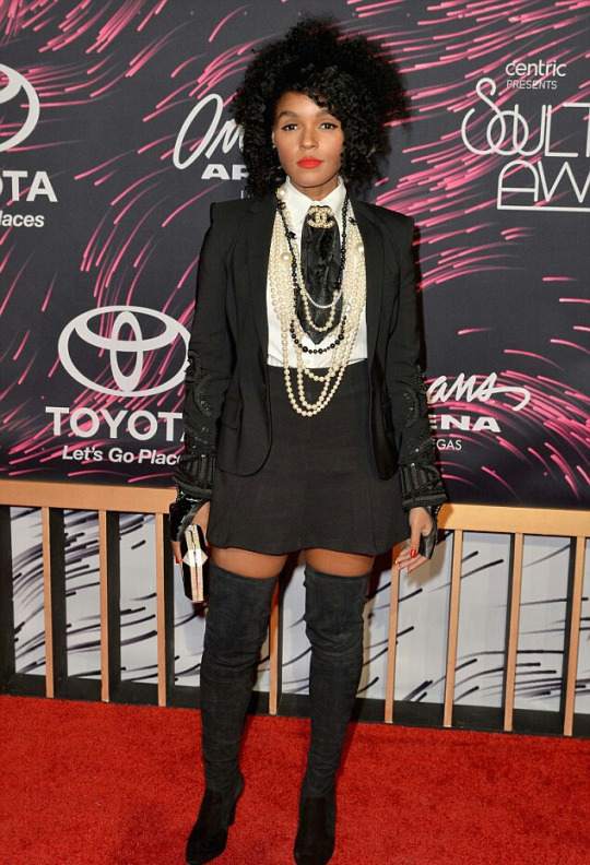 Janelle Monae worked her black and white color palette in a Chanel ensemble and Stuart Weitzman thigh high boots.