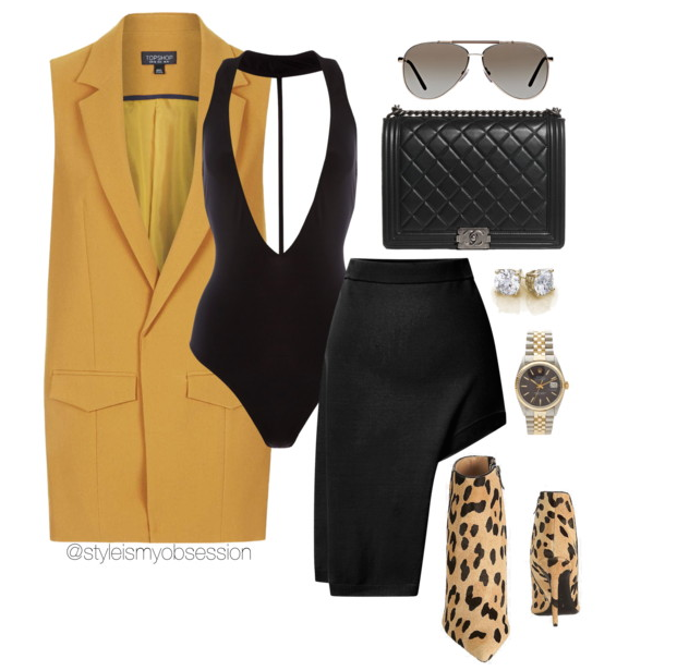 Headed to a fab shopping party (?!?). Punch up a black halter and skirt with a yellow Topshop vest.