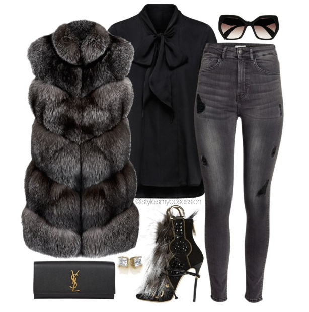 Head out for date night in a black pussy bow top, jeans, and a fluffy, statement making vest.
