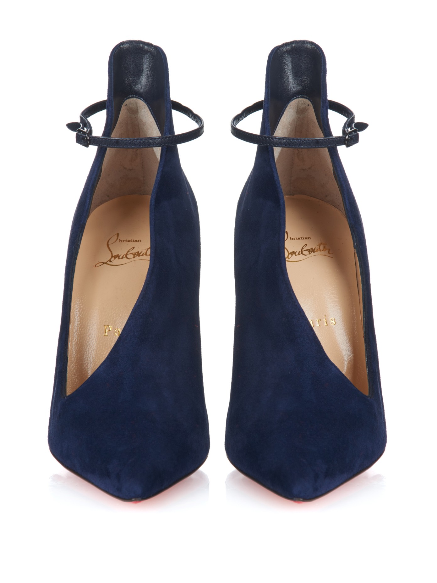 Her Italian made navy suede half bootie features an asymmetric upper and a thin adjustable leather ankle strap.