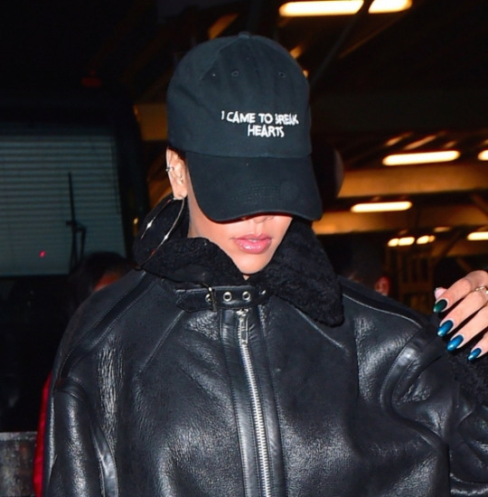 Hot! or Hmm…: Rihanna’s The Weeknd Barclay’s Concert NasaShop I Came to Break Hearts Cap, Vetements The Transformer Black Shearling Jacket, and Manolo Blahnik Chaos Sandals