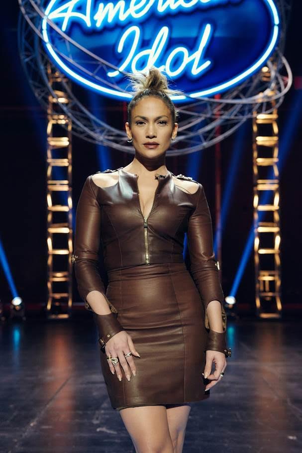 Jennifer Lopez wore a chocolate brown leather August Getty Spring 2016 ensemble to American Idol’s latest LA stop.