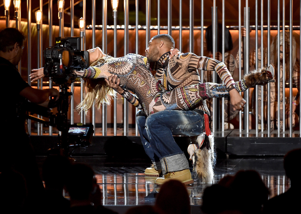 She showed off her Fly Girl dance moves in a rousing performance wearing a DSQUARED2 custom-made multicolored tulle bodysuit embroidered throughout with sequins and encrusted diamonds with a tribal print fur coat.