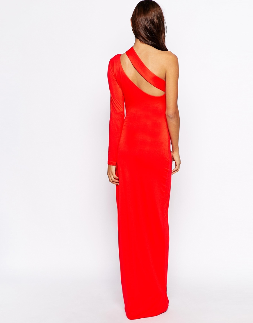 The almost sold out dress has an asymmetric neckline, a cut out design, and a full length sleeve.