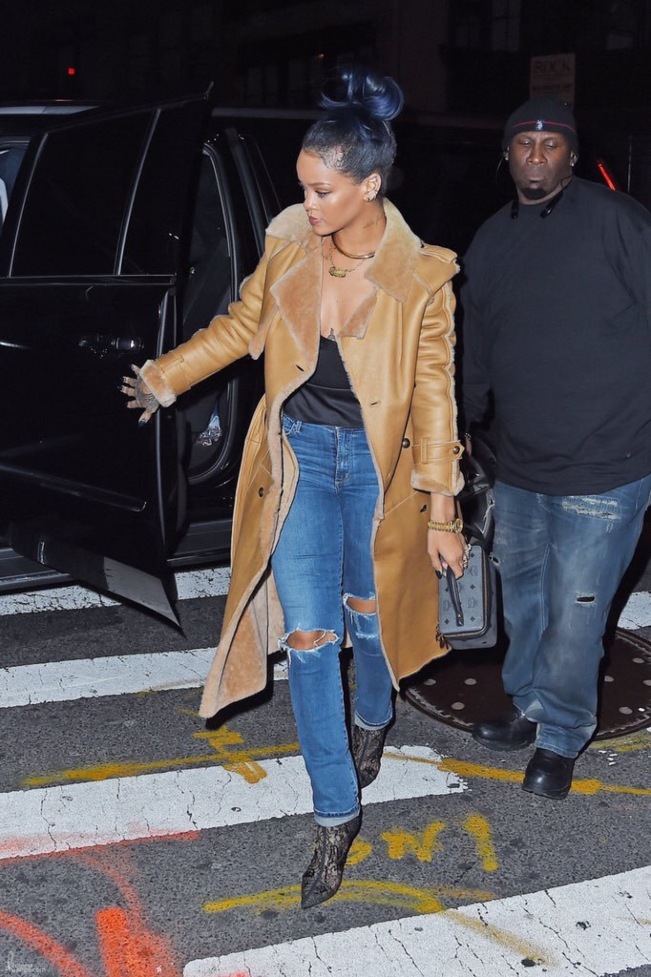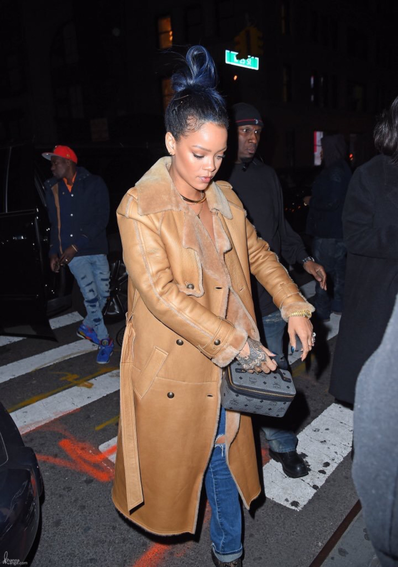 Rihanna has been hitting this NYC streets with a vengeance! Friday night saw her keeping it colorful in a $2,645 Ulla Johnson ‘Hawke’ coat over a Guns N Roses tee, denim shorts, and $270 Kurt Geiger Carvela Velvet Thigh High Boots: