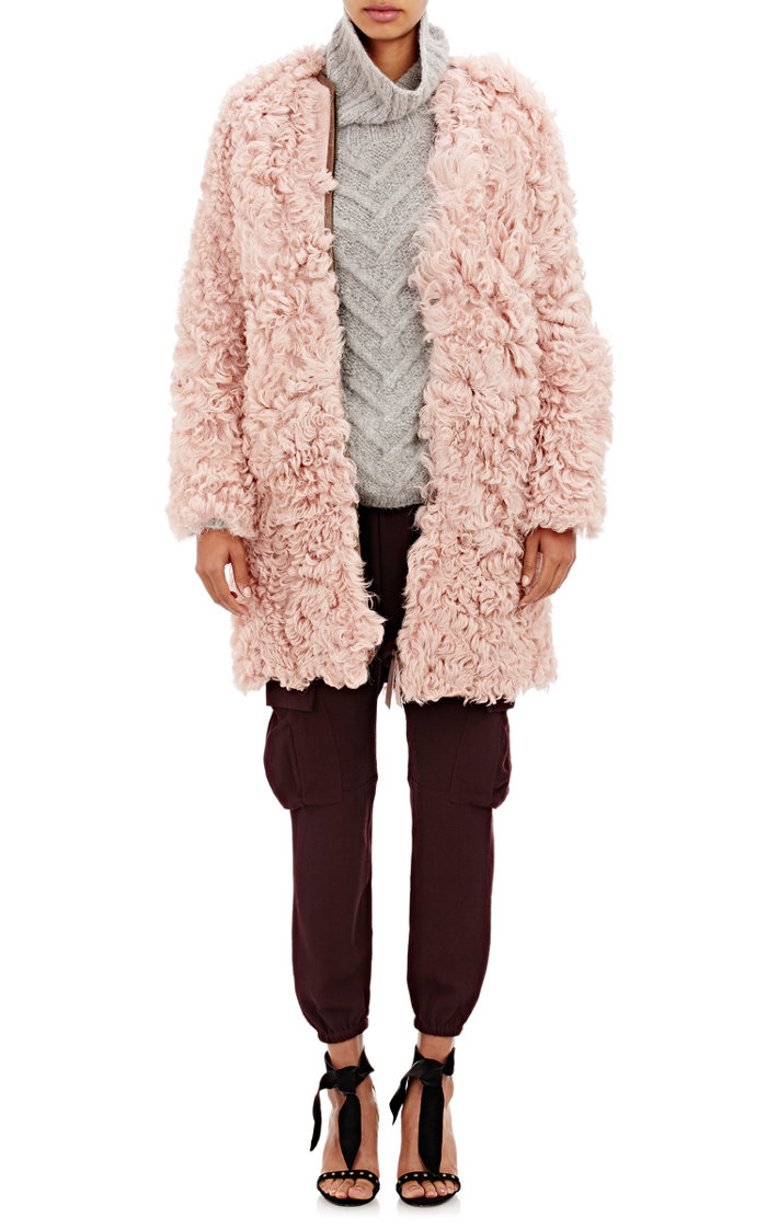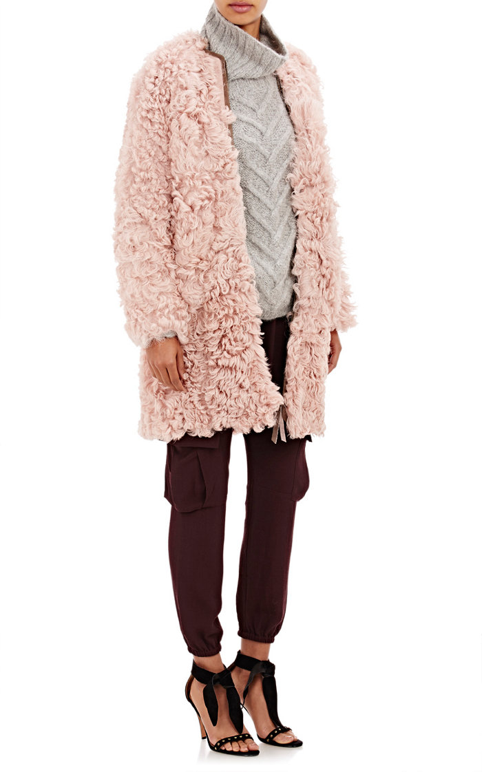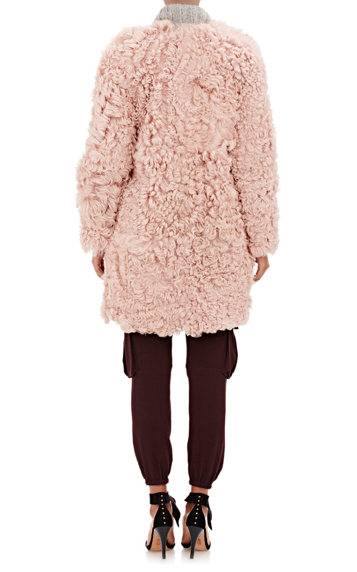 Her coat is fashioned out of lamb fur, and is lined in suede.