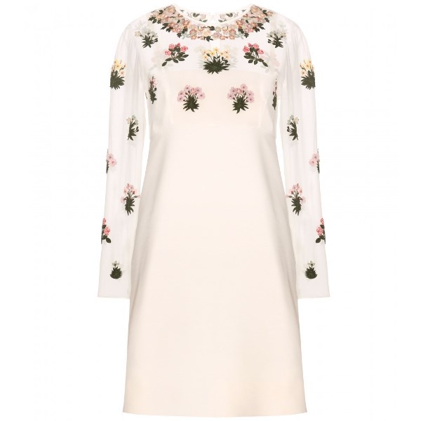 Her cream silk dress features beading and appliqué, and a sheer yoke and sleeves.