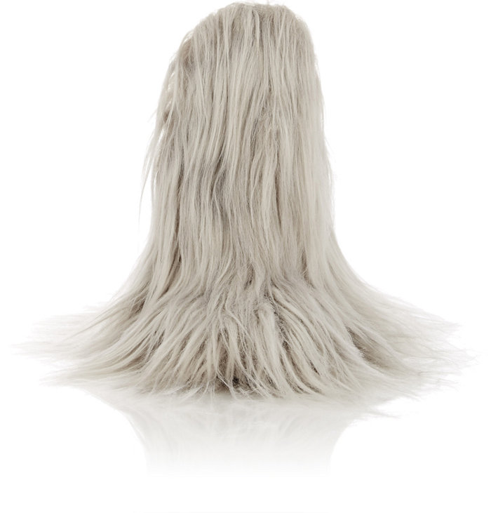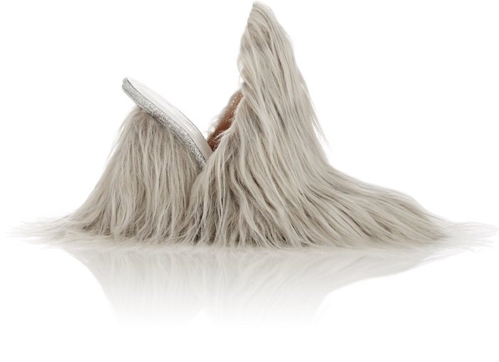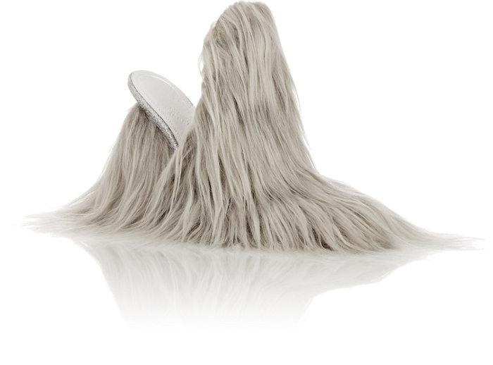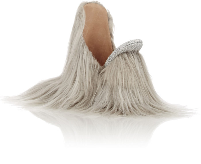 The light grey faux-Mongolian fur and silver glitter mules have a 3.75″ heel and an asymmetric square toe.