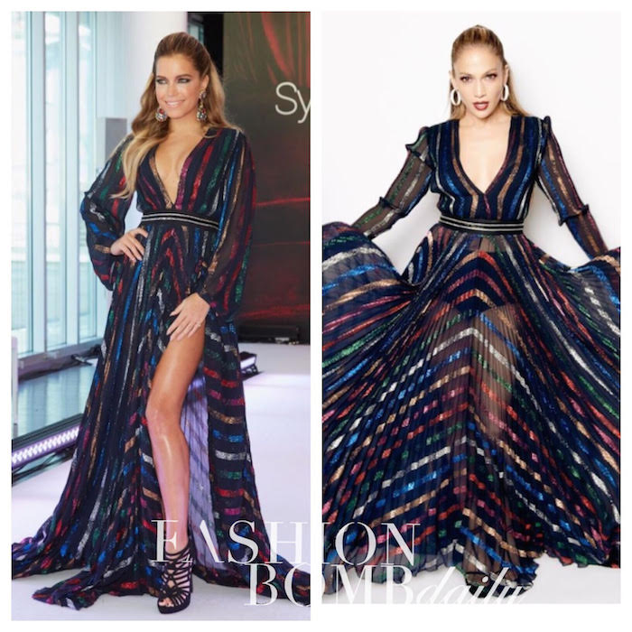 Dutch TV personality and model Sylvie Meis celebrated her Deichmann Shoe Collection Unveiling in the same Blumarine Long-Sleeve Plunging Multicolor Stripe Slit Gown Jennifer Lopez originally sported back in April: