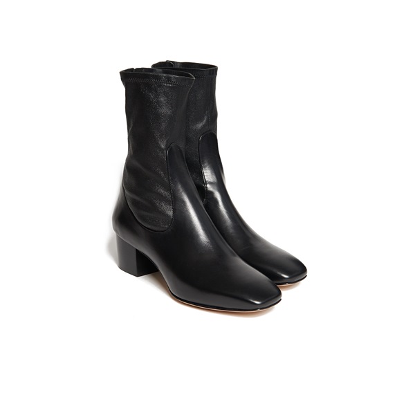 Her black leather boots feature a square-toe silhouette and functional 2″ heels.