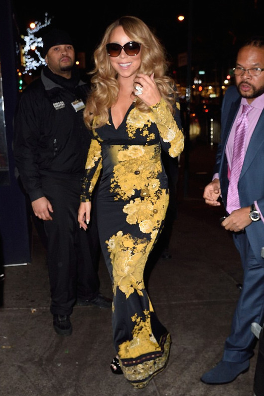 Mariah Carey hit the scene in New York City in a $1,345 Roberto Cavalli yellow and black printed gown: