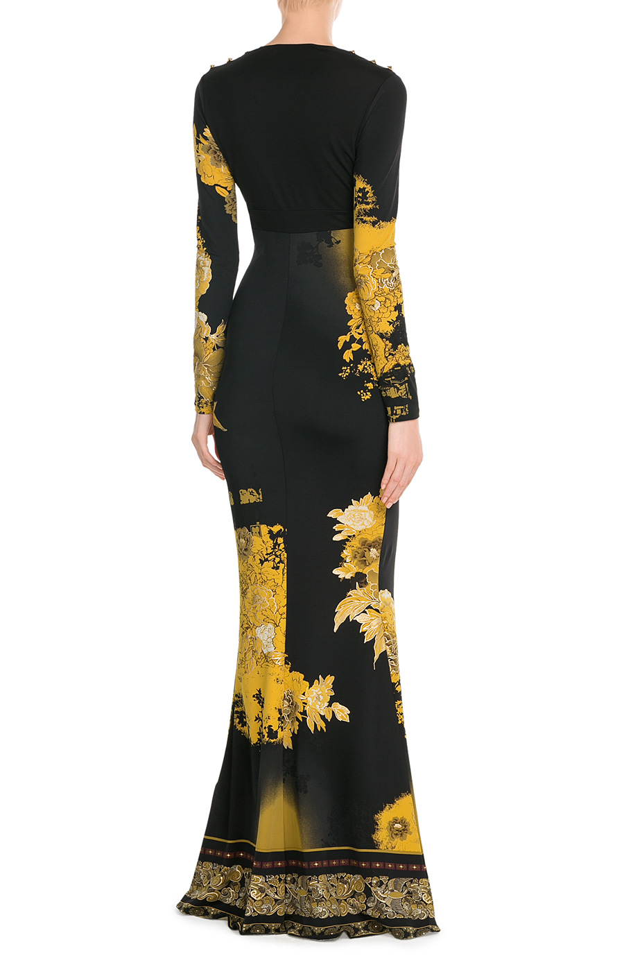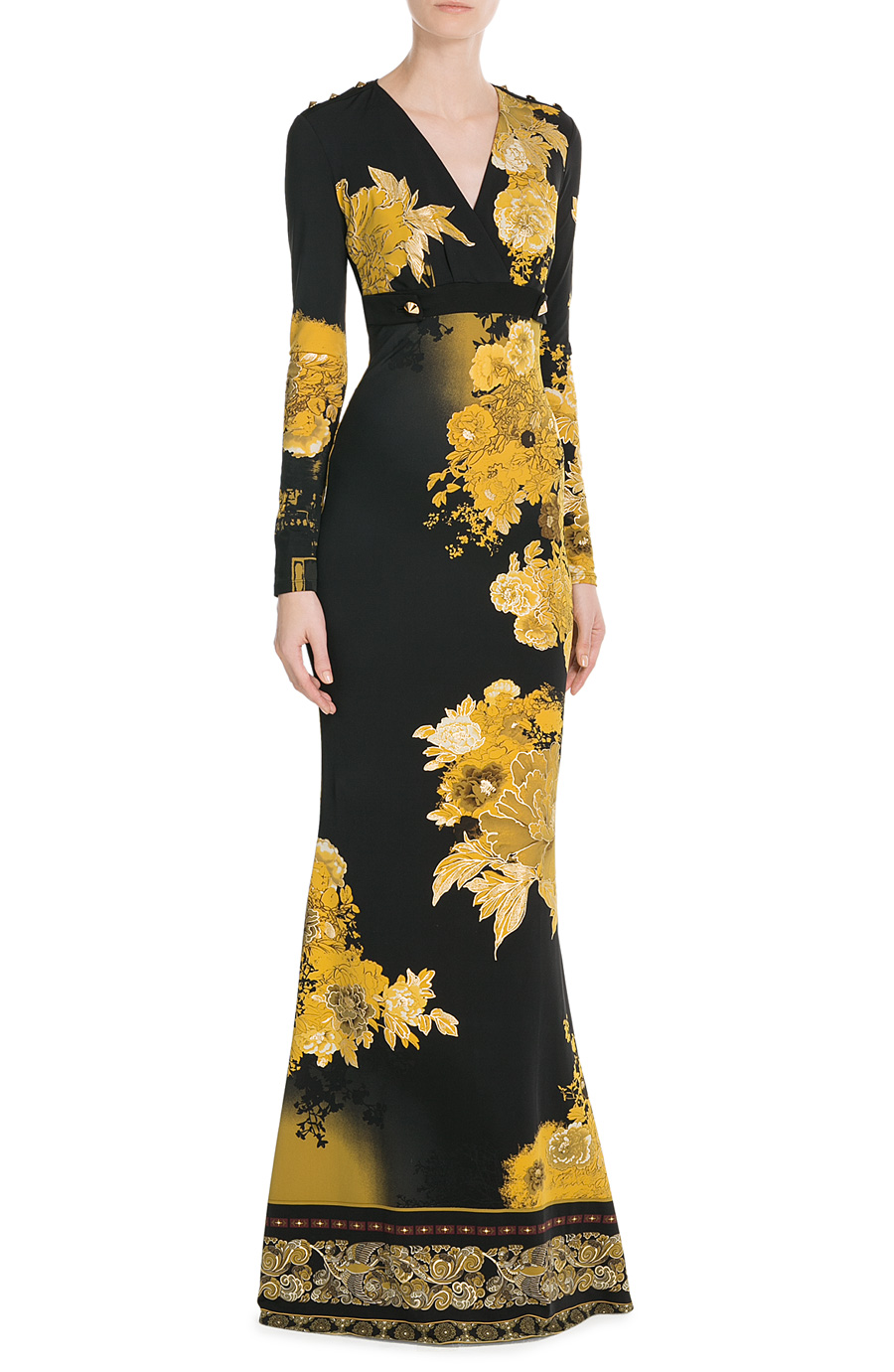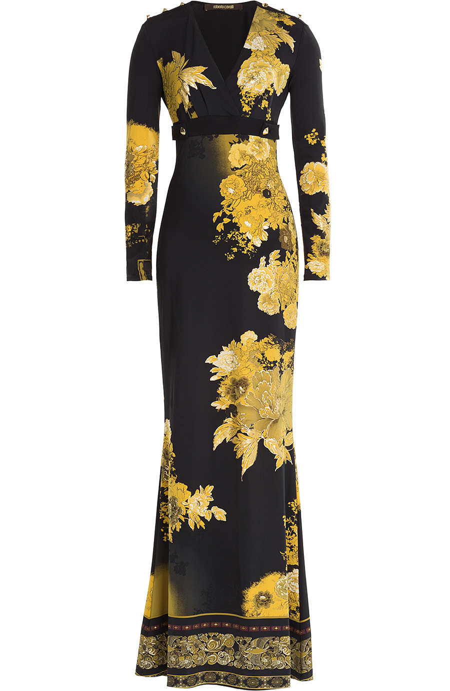 Yellow-gold flowers cover the floor-sweeping silhouette of this black Roberto Cavalli gown.
