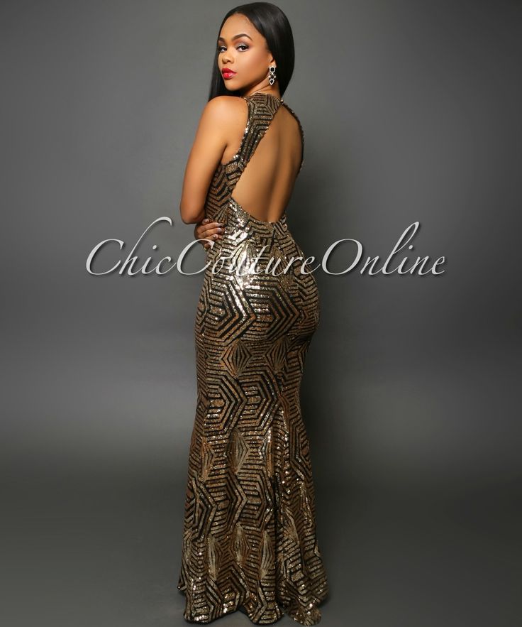 As the holidays start rolling around, I know what the infinite question on your mind is: What am I going to wear to these holiday parties? Whether with co-workers, family, friends or a romantic out with the beau, you might want to check out our Bomb Product of the day, ChicCoutureOnline’s Draya Black Gold Sequins-Key Hole Back Gown .
