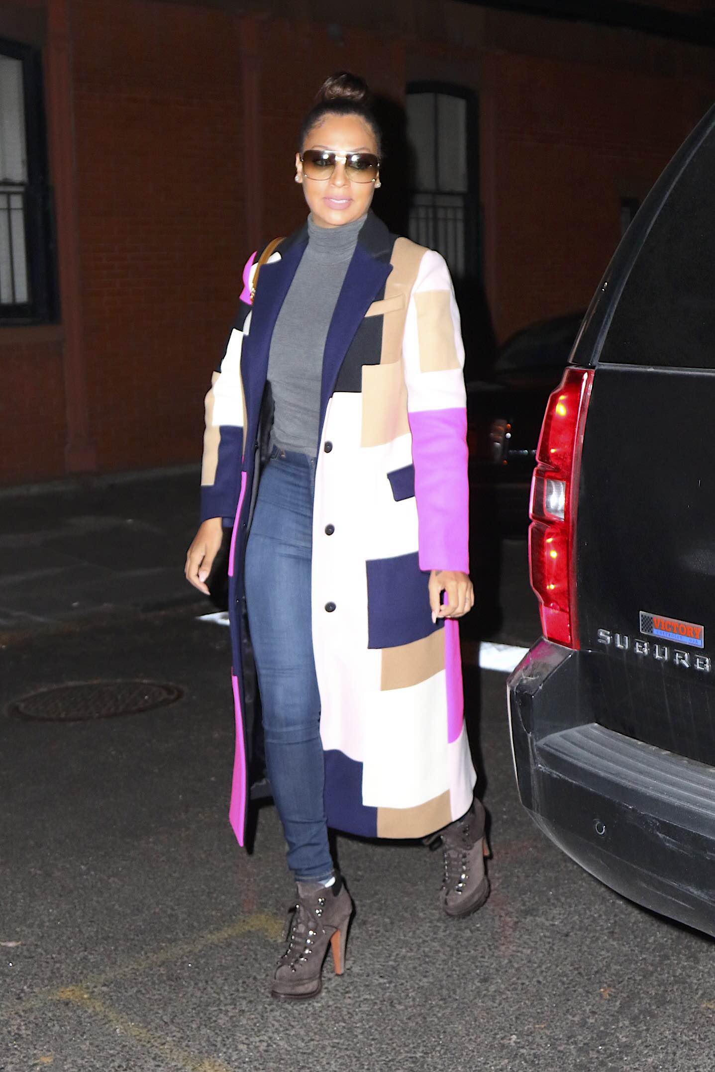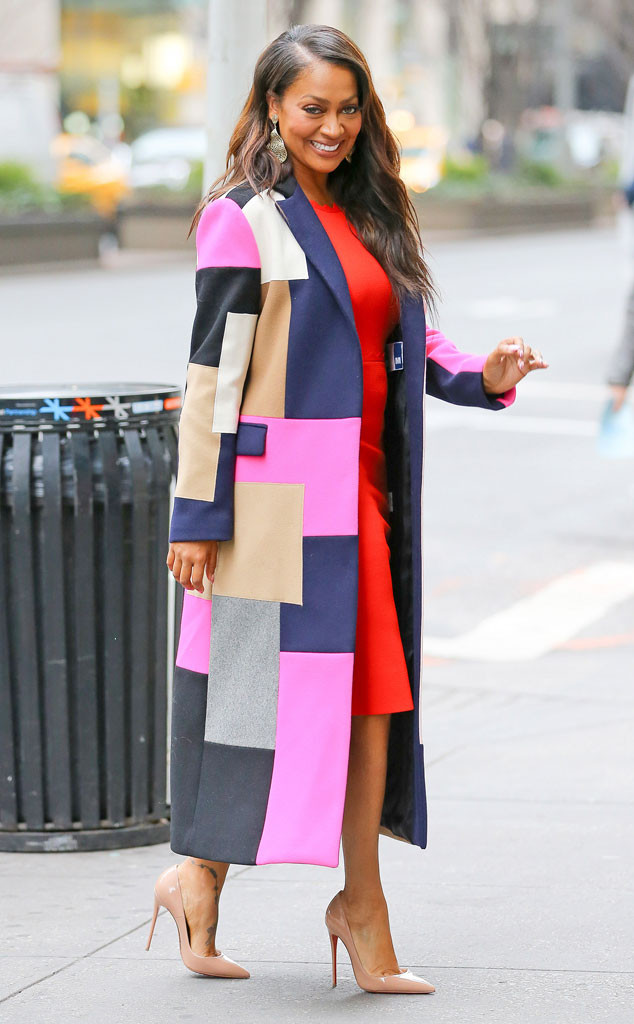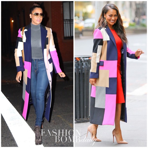 The lovely Lala Anthony made her way through New York City wearing the same vibrant MSGM Fall 2015 Pink, Tan, Black, Navy and Gray Patch Long Coat she first wore earlier this month: