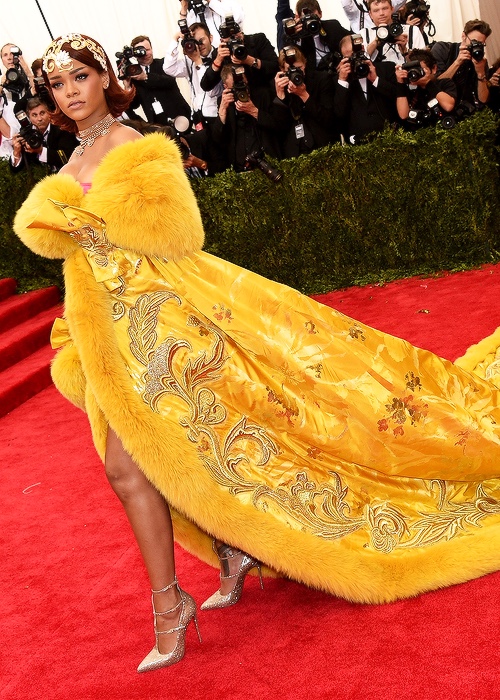 Style extraordinaire Rihanna has had quite the fashionable year! The 27-year old bombshell held us captive as she flaunted some of the most eye-catching (and controversial) outfits. But, it was her 2015 Met Gala showstopper that shook the globe. The singer arrived on the red carpet while uplifting a Guo Pei 2010 Couture yellow fur trimmed gown that screamed oriental goodness!