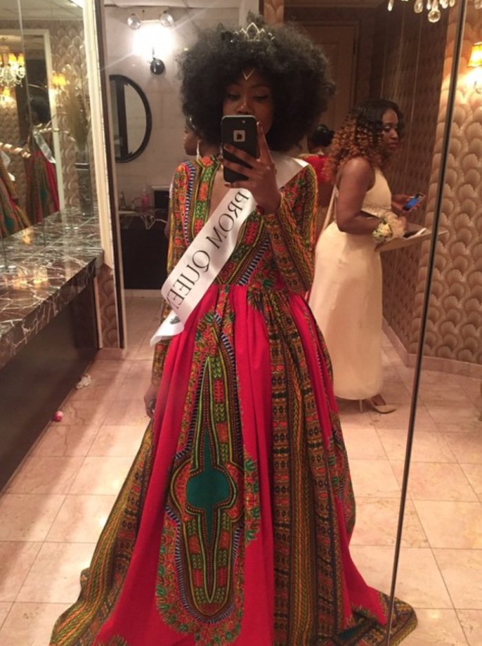 I’m so excited about our next nominee! Kyemah Mcentyre literally came out of nowhere with her original African print gown. While high school seniors across the country were sifting through pages of magazines looking to the hottest celebs for inspiration, this rising designer took the creative route and concocted her own sartorial masterpiece.