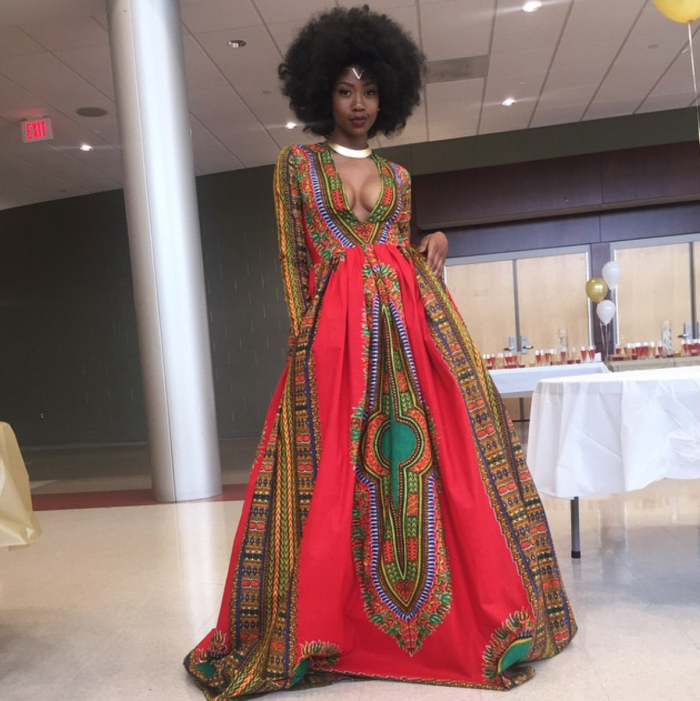 Kyemah’s breathtaking dress showcases a plunging neckline, a full skirt and a striking print. The Instagram sensation kept her accessories to a minimum as she donned a simple gold choker and a matching gold head piece. She looks so regal, no?