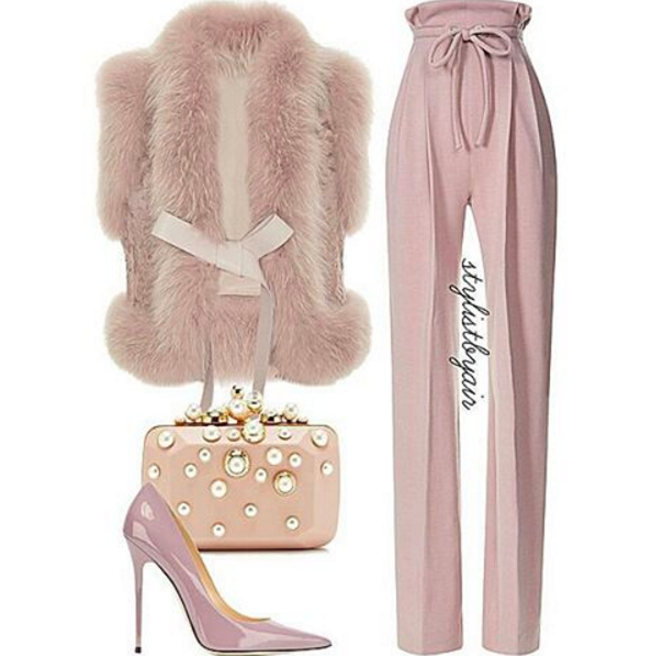 Keep monochrome going into 2016 with a pink furry vest by Elie Saab and high waisted drawstring pants by Rodarte.