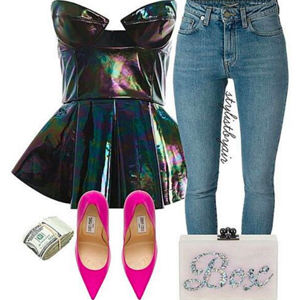 While we chose a Cushnie et Ochs top, jeans, and Jimmy Choo pumps, you can work with options for less, including this cute number from Lulu’s.