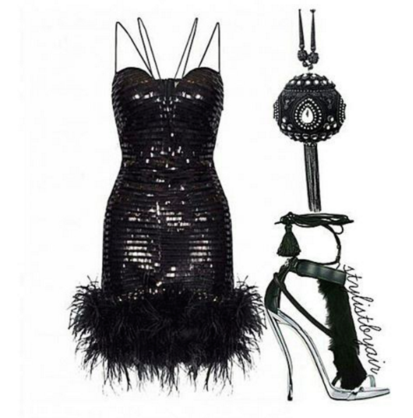 Sequins are always a good idea! Pair a $120 Rare Opulence feather trimmed black cocktail with feathered sandals and a Jennifer Le Cairo clutch. Get the exact dress here, or play with a few other sequined options by the brand below: