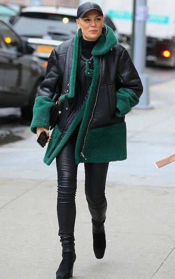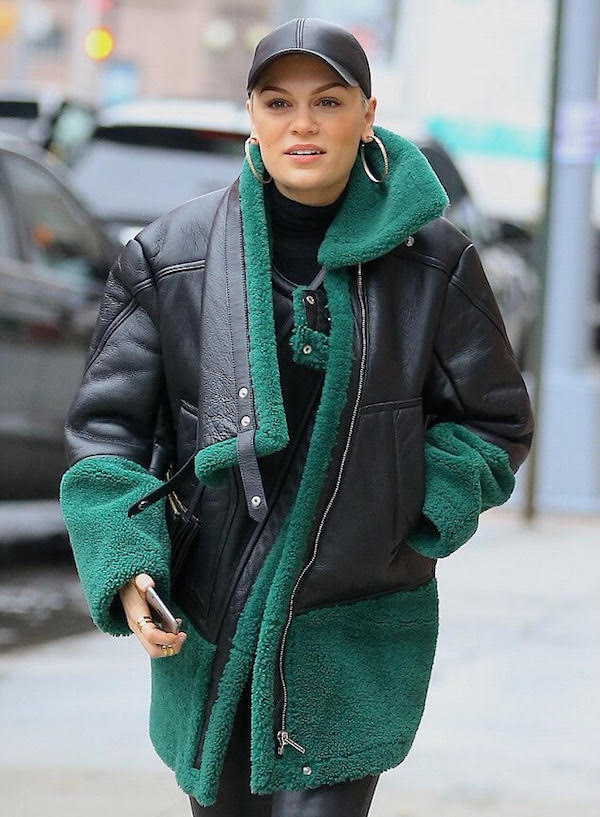 Do you see this coat?! Yes, indeed! Jessie J kept it cozy in New York City while wearing a $3,790 Fall 2015 Kenzo Sheep Shearling Green Asymmetric Front Zip Jacket: