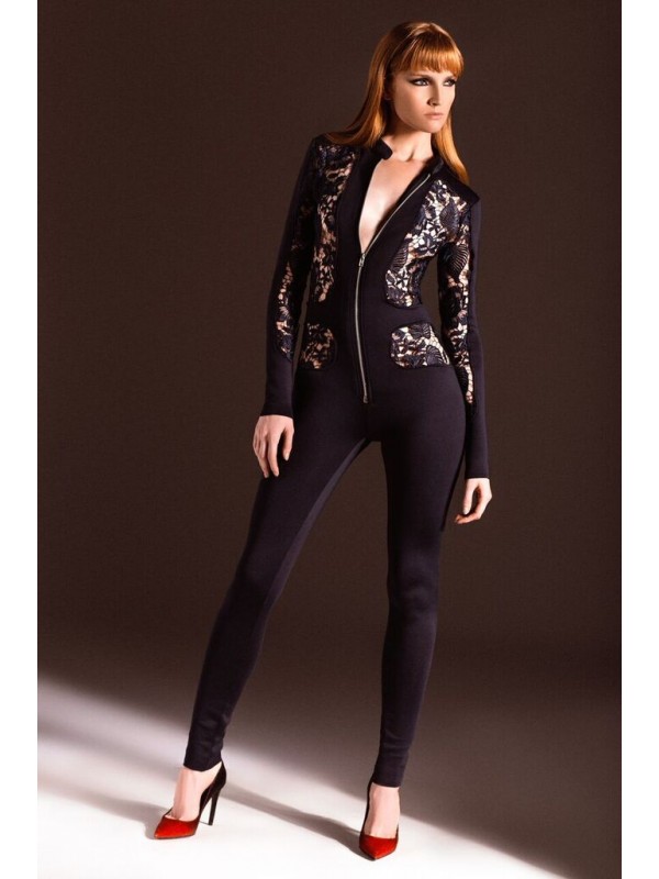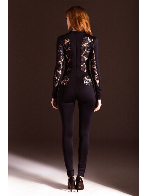 Her jumpsuit has lace insert and a form fitting silhouette.