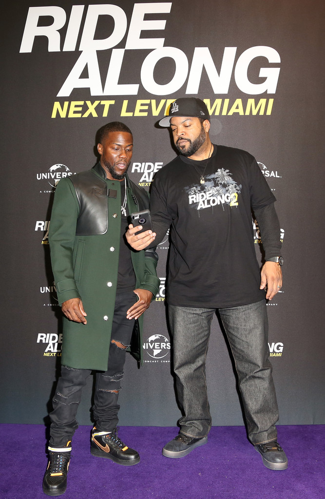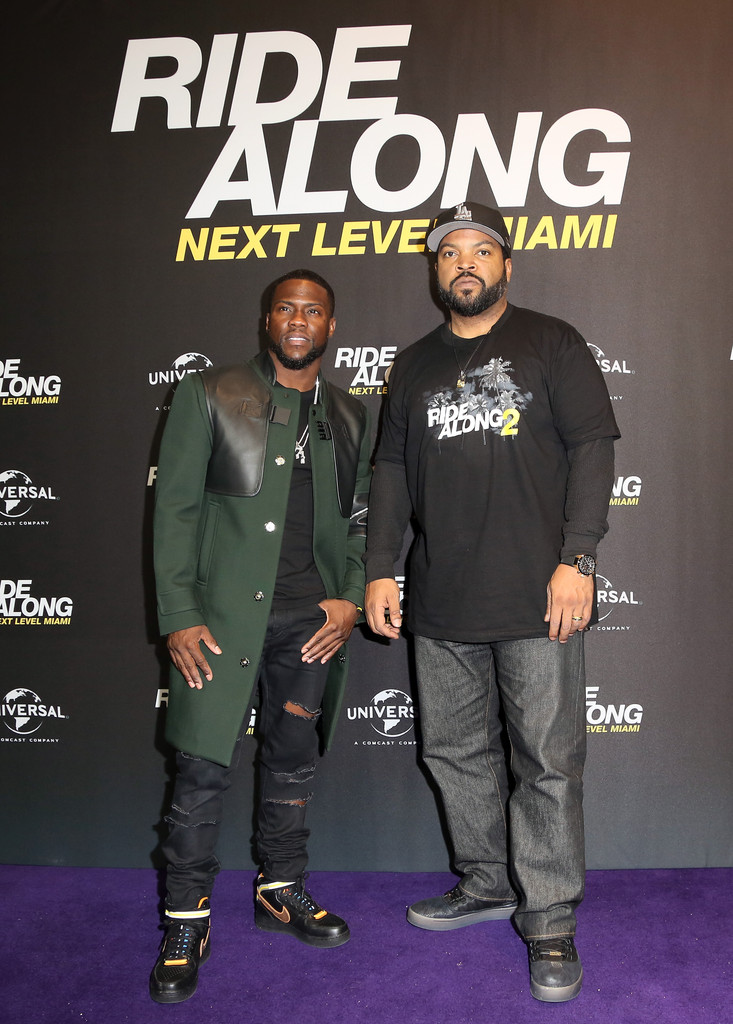 Yep! Kevin Hart attended the Ride Along Germany Premier in a Fall 2015 coat by Belgian designer Tim Coppens. The virgin wool-cashmere melton coat is detailed with smooth leather.