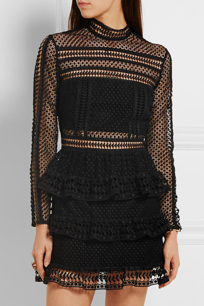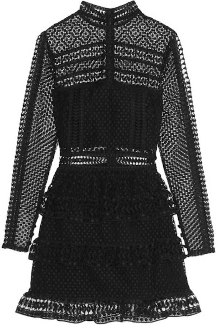 Her fab frock features a Victorian-inspired neckline, long sleeves and a tiered skirt. Self Portrait Black High Neck Tiered Lace Long Sleeve Mini Dress 1