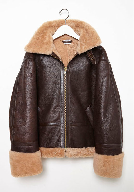 Her sold out jacket has an oversized fit and is trimmed in warm shearling.