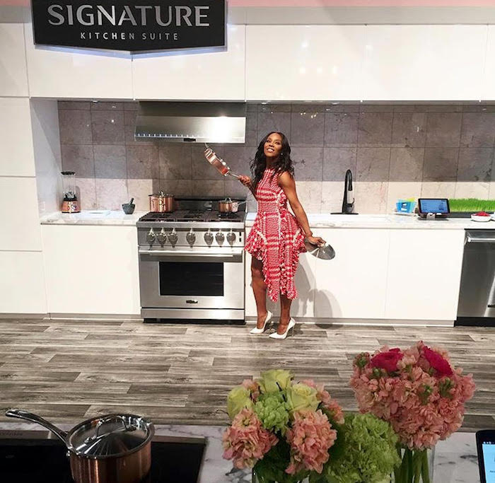 Celebrity Stylist and designer June Ambrose took to Instagram while ‘werking’ a Simone Rocha Fall 2015 Red And White Gingham Pearl Accented Pocket Side Ruffle Mini Dress: