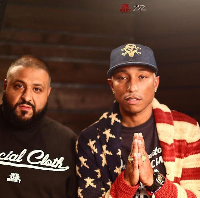 Pharrell Williams posed alongside ‘Major Key’ DJ Khaled while on the ‘Gram clad in a $225 Ralph Lauren American Flag Inspired Shawl-Collar Cardigan: