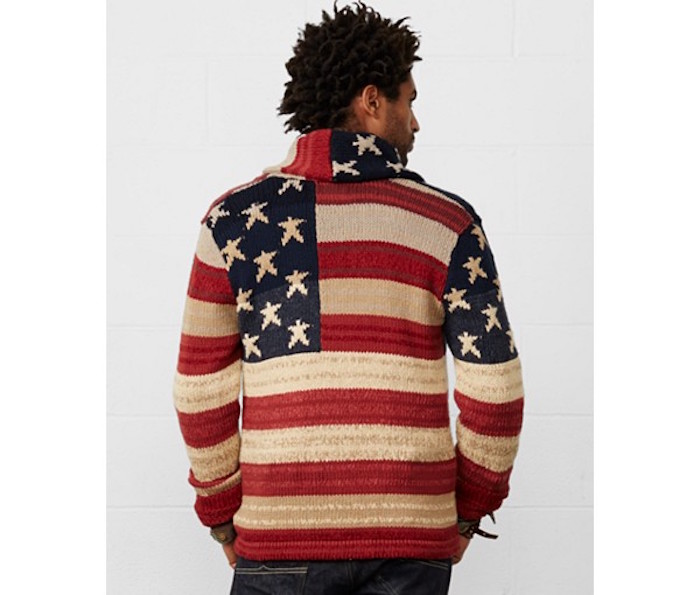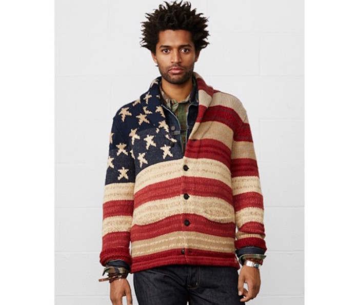 His shawl-collar cardigan is crafted from a hardy blend of cotton and linen and designed with an American flag-inspired pattern.