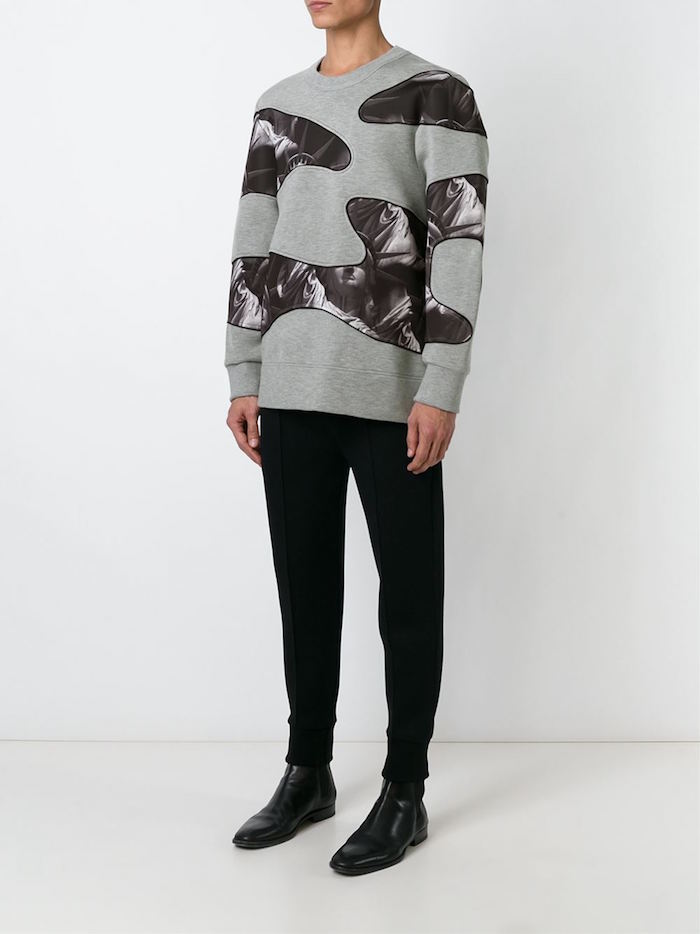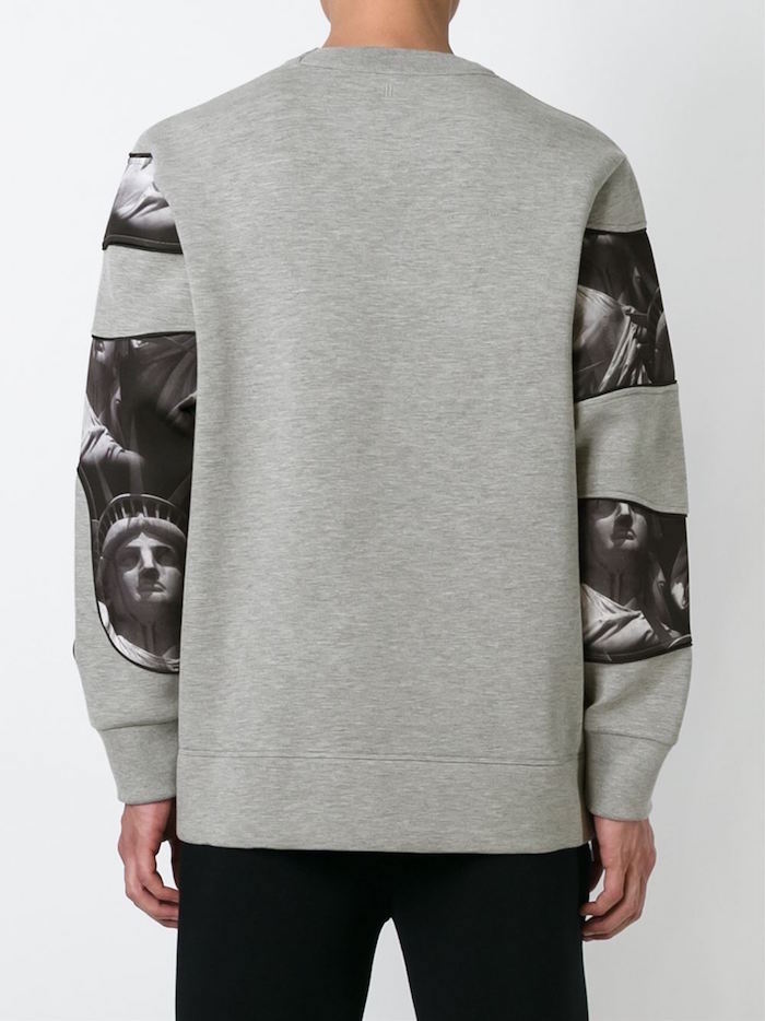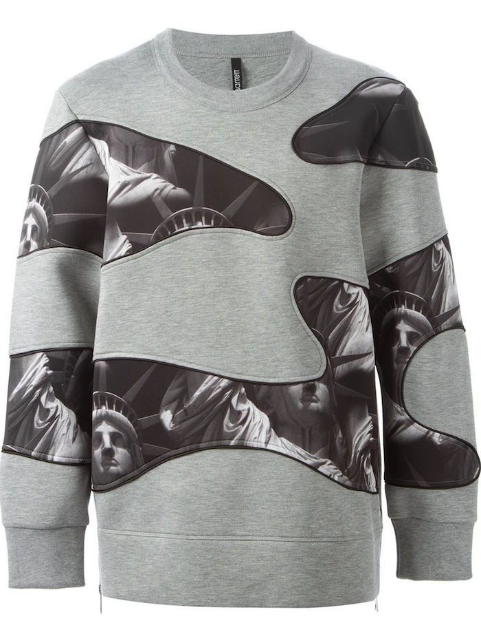 His black cotton blend sweater features a crew neck, long sleeves, elasticated cuffs, a straight hem and dark grey asymmetric inserts with a Statue of Liberty print.