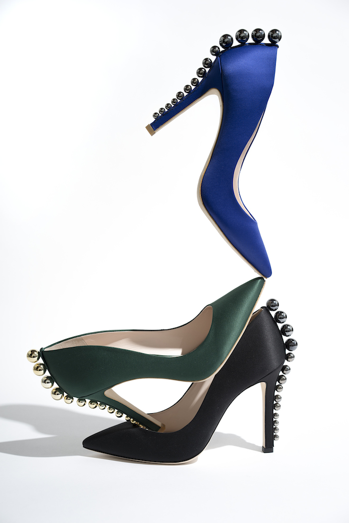 Prices range from $185 for flats to $375 for pewter ball embellished pumps.