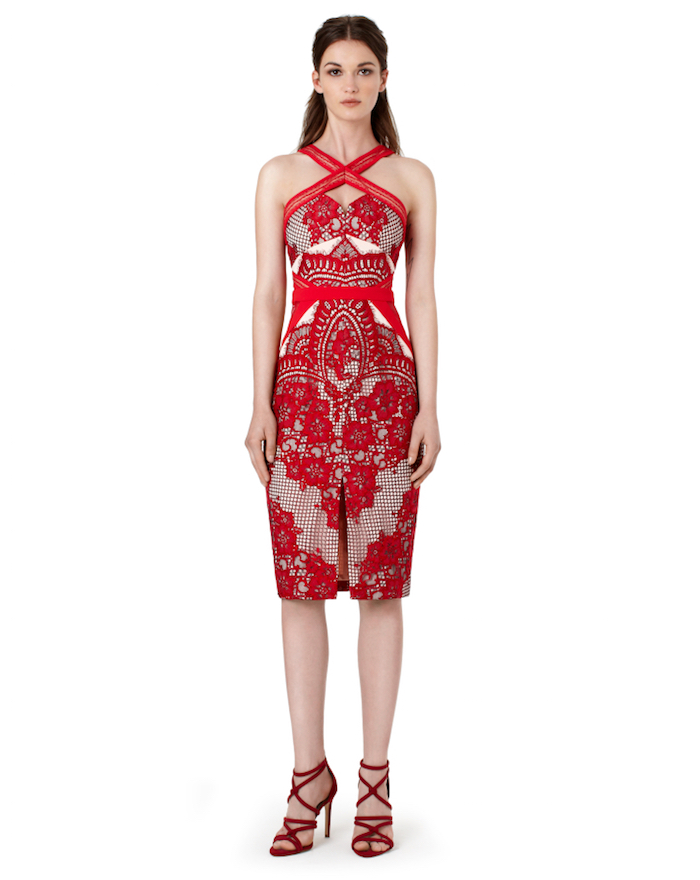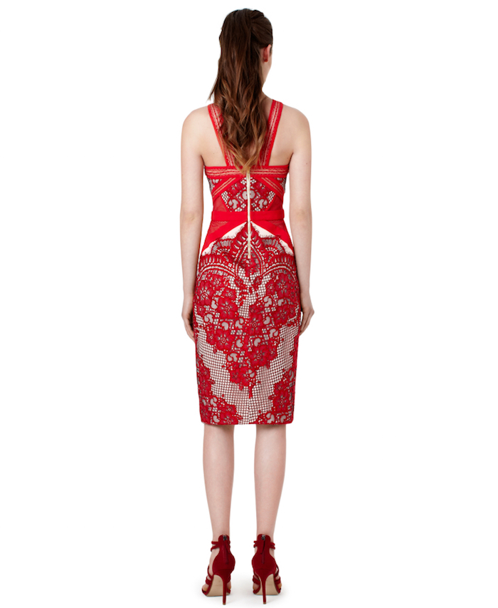 Jamie Chung attended SVEDKA Vodka’s Broken Resolutions Bash in a $425 Three Floor Aruba Red Lace Mesh Insert Front Slit Crossover Neck Midi Dress: