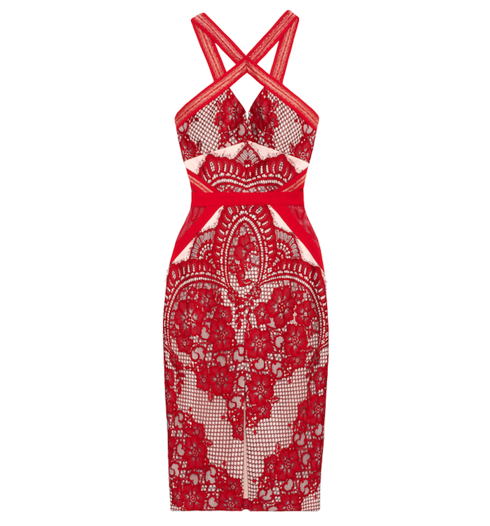 Her lace midi dress features gauze mesh inserts, a front slit and a crossover neck design to the front and back