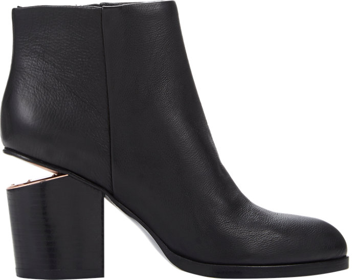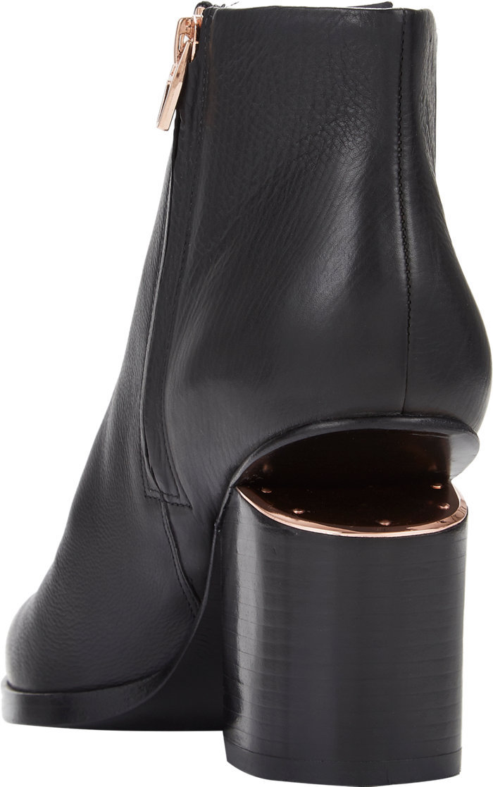 Crafted of black grained leather, her ankle boots are detailed with a tapered toe and cutout heel inset with rose goldtone metal.