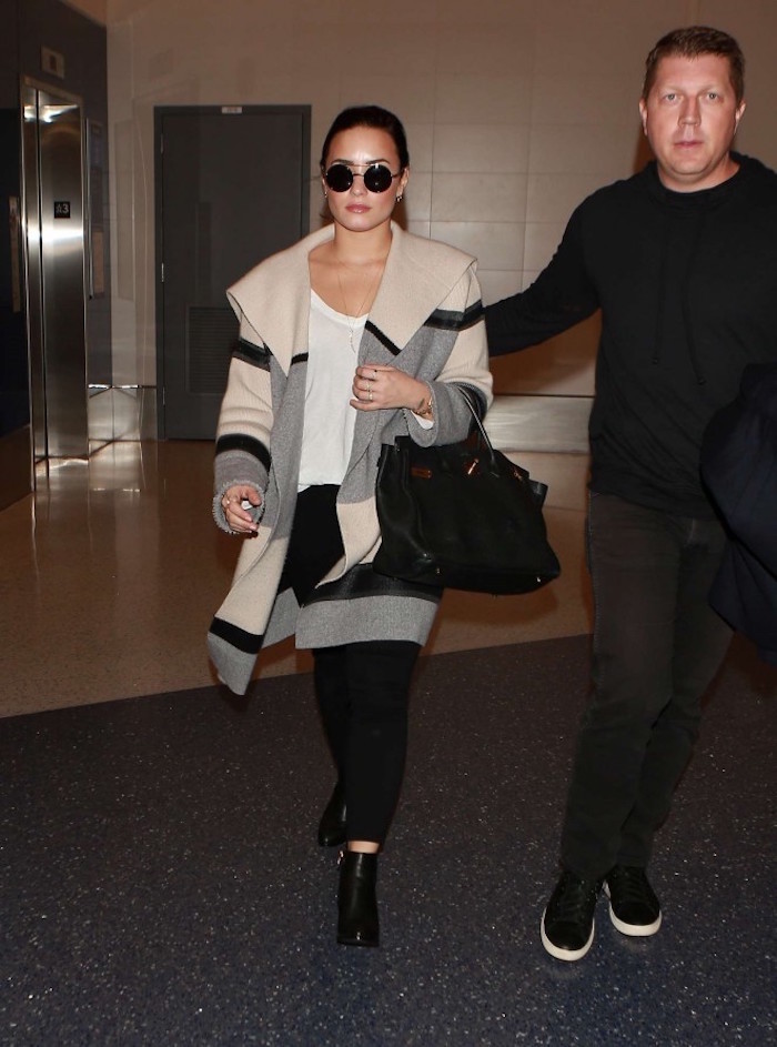 Demi Lovato was spotted at LAX airport in Los Angeles clad in a $495 Vince Colorblock Wide Collar Wool Cashmere Coat and $675 Alexander Wang Gabi Cutout Heel Rosegold Tone Inset Leather Ankle Boots: