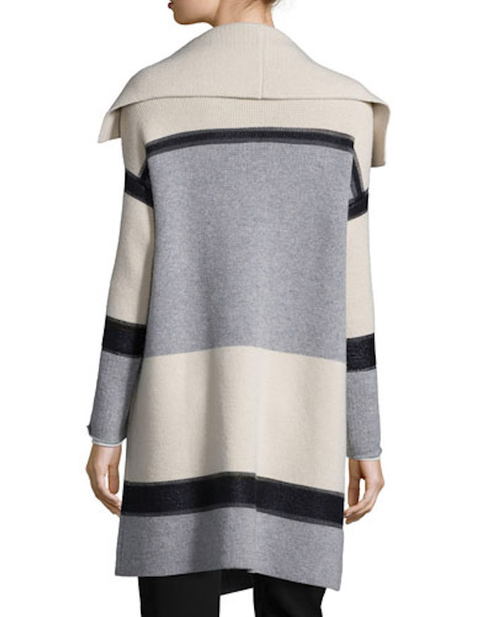 Her mid-thigh colorblock wool/cashmere coat features a loose silhouette with a wide spread collar and open front.