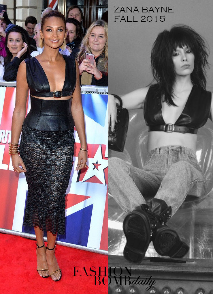 Alesha Dixon sported her second all-black look of the week! This time, she slipped on a Zana Bayne Fall 2015 Black Leather Belted Crop Top, $375 Vivian Corset Belt, and Martina Spetlova Spring 2016 Black Sheer Perforated Pencil Skirt at the Britain’s Got Talent London Auditions:
