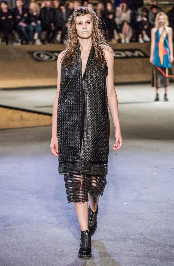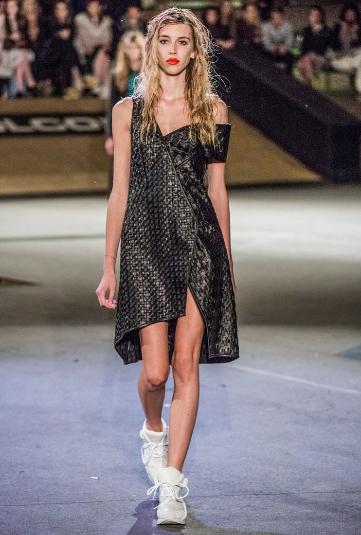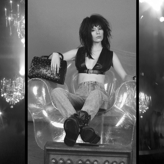 Her top was paired with a rocker chic cut, studded bag, high-waist denim, and studded combat boots in the brand’s Fall 2015 lookbook.