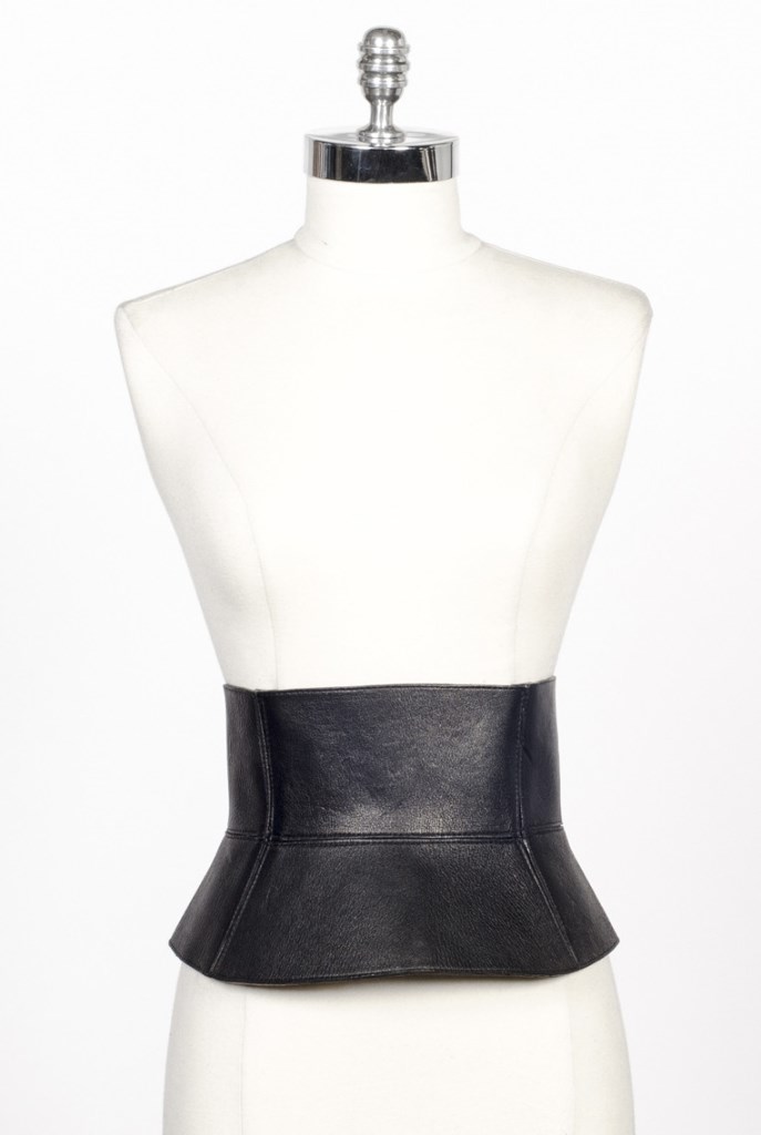 Her smooth and structured corset belt features stitched seam detailing and three adjustable buckles in the back.