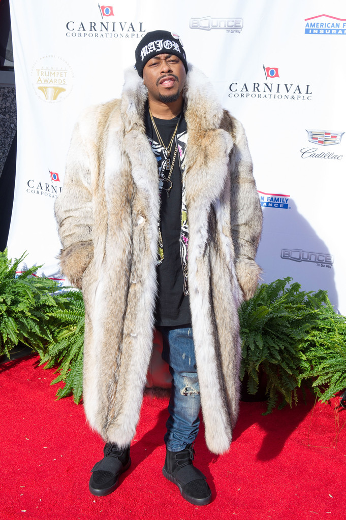 A cozy long fur, graphic knit and t-shirt, destructed denim, and Yeezy kicks were Raheem Devaughn’s choices. A bit too much going on here for my taste…